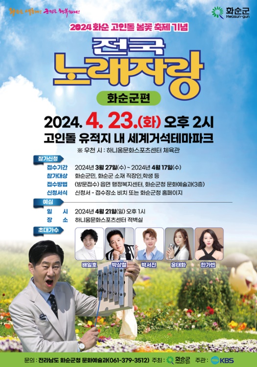 전국노래자랑 화순군편 초대가수가 부른 노래는 배일호의 아우야, 박상철의 산수갑산, 윤태화의 조사하면 다 나온다, 박서진의 지나야, 한가빈의 잘살아봅시다 등의 무대가 있었습니다.