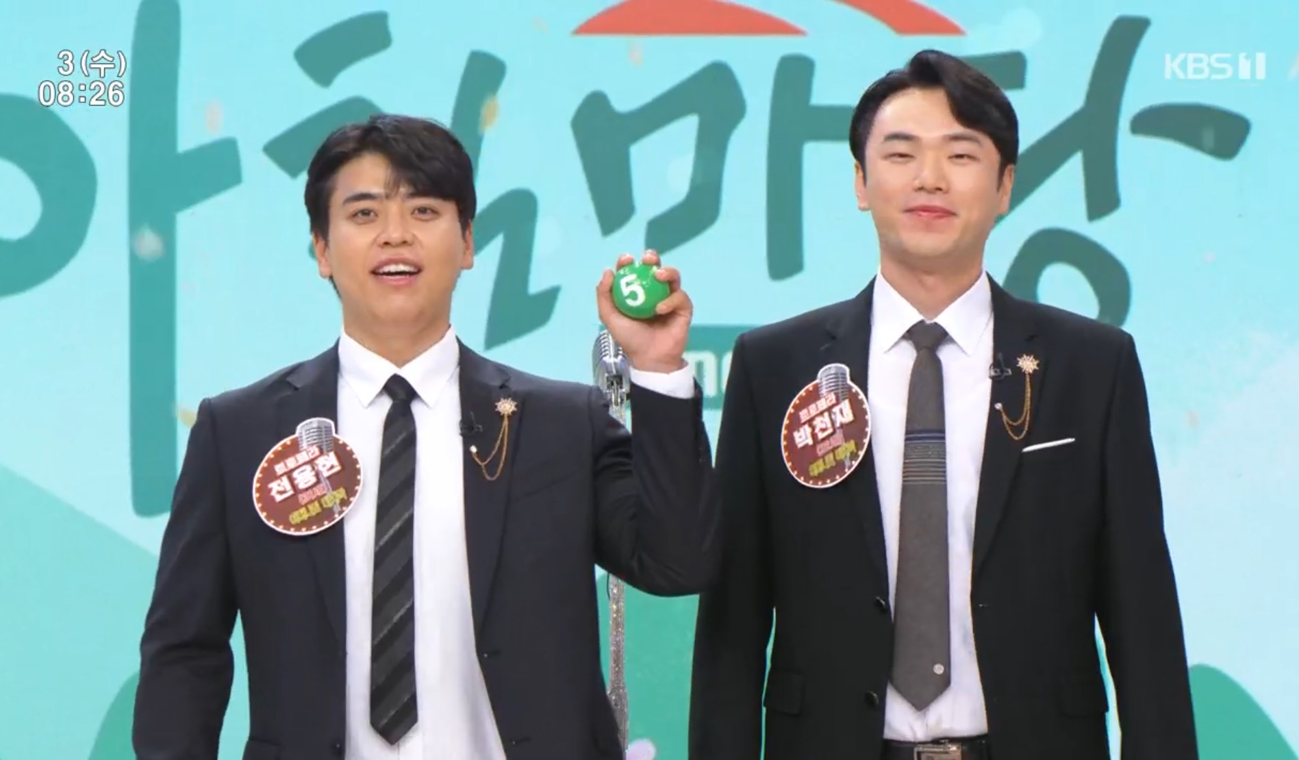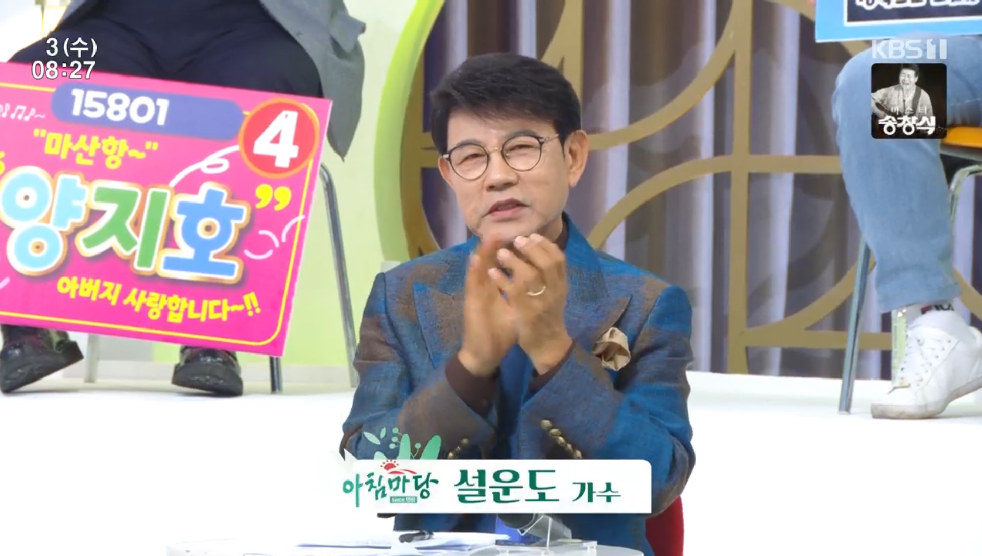KBS1 아침마당 7월 3일 수요일 도전 꿈의 무대에는 박지후, 김연준, 성지영, 양지호, 트로페라가 출연했습니다. 초대가수이자 패널로는 설운도가 출연했습니다.