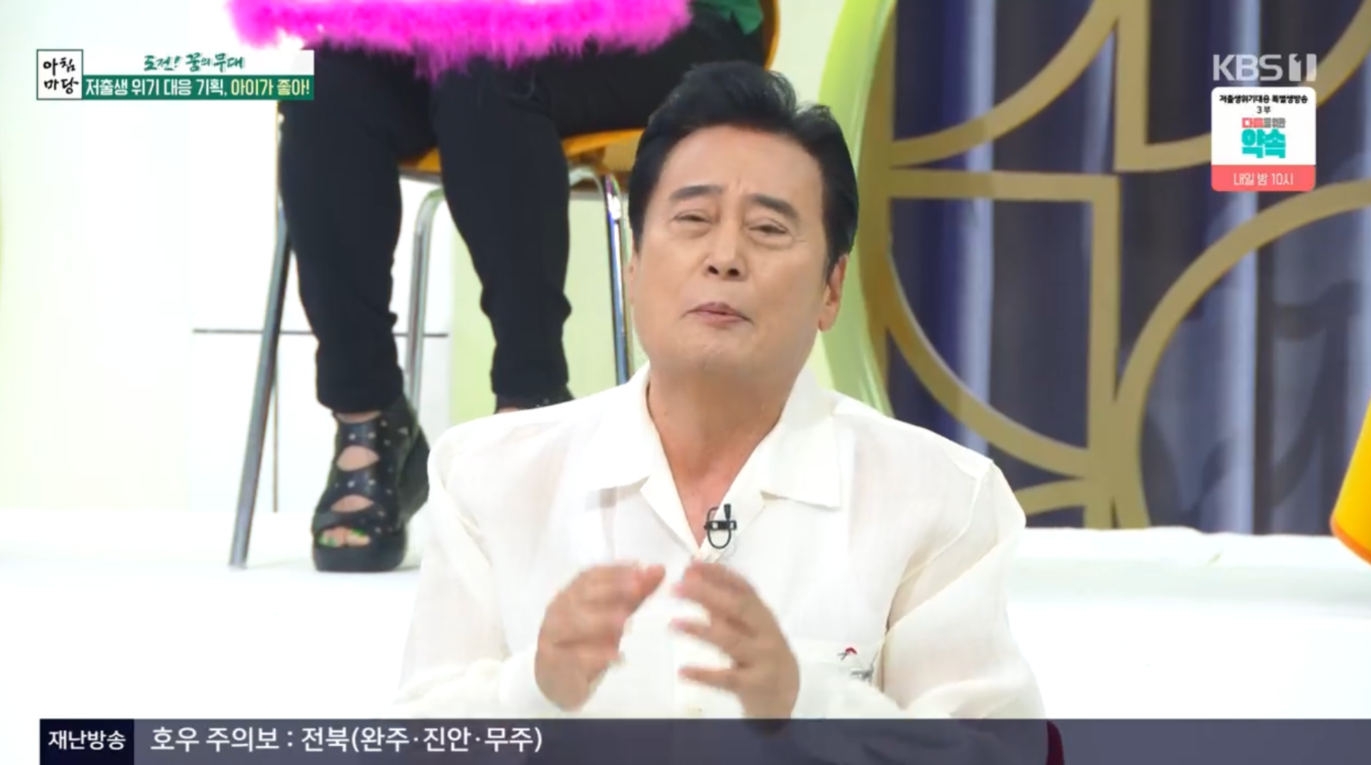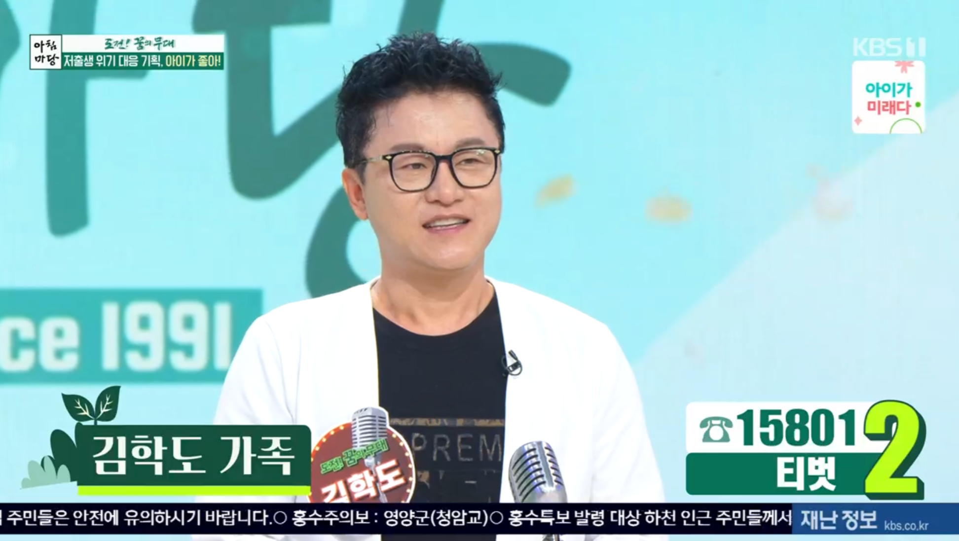 KBS1 아침마당 7월 10 수요일 도전 꿈의 무대는 저출생 위기 극복 자녀는 나의 힘 특집으로 김승권 가족, 김학도 가족, 서재걸 가족, 신재협 가족, 유호 가족이 출연했습니다. 초대가수이자 패널로는 김성환이 출연했습니다.
