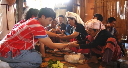 마지막 위로 음식을 찾아간 곳은 카렌족(Karen) 반빠끌루어이(Ban Pa Kluay) 마을입니다. 전 세계 2위 규모의 쌀 수출국답게 계단식 논이 즐비합니다. 모내기가 끝난 걸 기념해 마을 사람 전체가 모이는 큰 잔치가 열리는 날이었습니다. 태국 토종 돼지 무판콰이로 할 수 있는 모든 돼지 요리가 총출동했습니다. 요리를 먹기 전 중요한 의식이 있다는데 어린아이부터 주민들 손에 실을 묶어주며 복을 기원하는 마을 최연장자 어르신들입니다. 외지인들의 행복까지 빌어주는 따뜻함에 뭉클함을 느끼고 여정을 마무리했습니다.