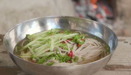 메밀 반죽을 틀에 넣고 국수를 뽑아낸 뒤, 샘에서 떠온 차가운 샘물에 채 썬 오이를 넣어 만들면 냉국 완성됩니다. 냉국에 면 사리만 넣어 먹는 막국수는 온새미 마을만의 별미입니다. 논이 없던 산촌에서 옥수수는 전분을 안쳐 올챙이국수로도, 팥소를 넣어 부꾸미로도 밥상을 책임져준 고마운 작물이었습니다. 떡메로 친 찰떡에 밀랍을 발라 만든 밀랍떡까지 더운 여름을 지혜롭게 견디며 정을 나누는 온새미 마을의 국수 먹는 날에 함께 해봅니다.