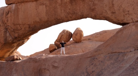 나미비아 자갈 평원에 우뚝 솟아 있는 화강암 봉우리인 스피츠코페(Spitzkoppe)의 봉우리에 올라서자 어느 곳 하나 붉지 않은 곳이 없는 나미비아를 보면 왜 레드 아프리카(Red Africa)라고 하는지 알 것만 같습니다. 자연이 만들어 낸 신비로운 스피츠코페 다리(Spitzkoppe Bridge)에서 기념사진도 남겨봅니다.