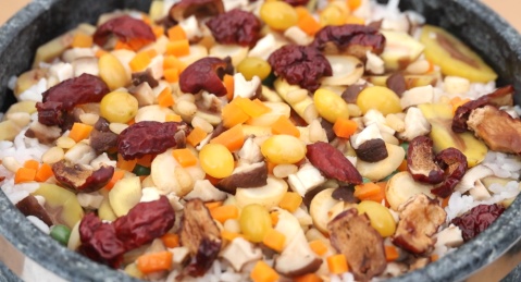 곱돌은 평범한 음식도 특별한 맛을 내게 하는 특징이 있습니다. 곱돌엔 공기층이 있어 음식의 풍미를 더해줍니다. 곱돌로 만들 오늘의 요리는 남녀노소 누구나 좋아하는 삼겹살과 영양밥입니다. 곱돌판 위에서 장수의 특산품인 꺼먹돼지 삼겹살을 올려 구우면 기름이 빠져 더 쫄깃해집니다.