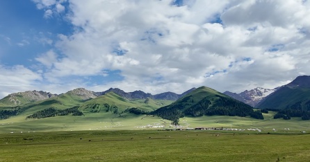 도로 구간의 절반이 해발 2,000m 이상인 그야말로 하늘길인 두쿠공루를 따라 도착한 곳은 천상의 초원, 나라티풍경구(那拉提旅游风景区)입니다. 총면적이 1,850㎢에 이르는 이곳 고산 초원에는 설산, 숲, 강, 호수 등 다양한 풍경이 펼쳐집니다.