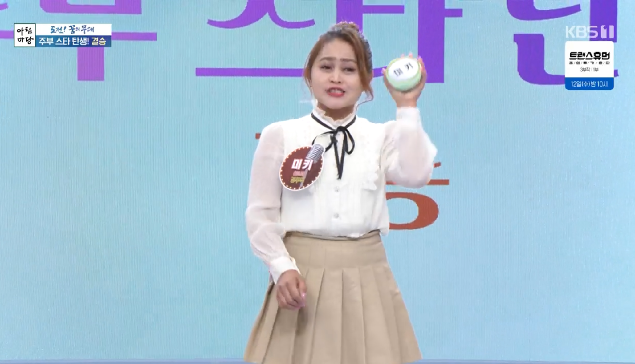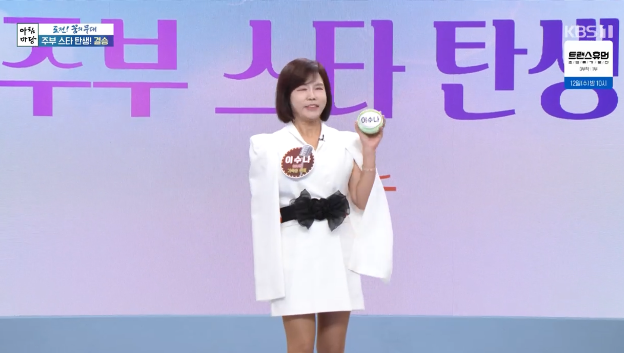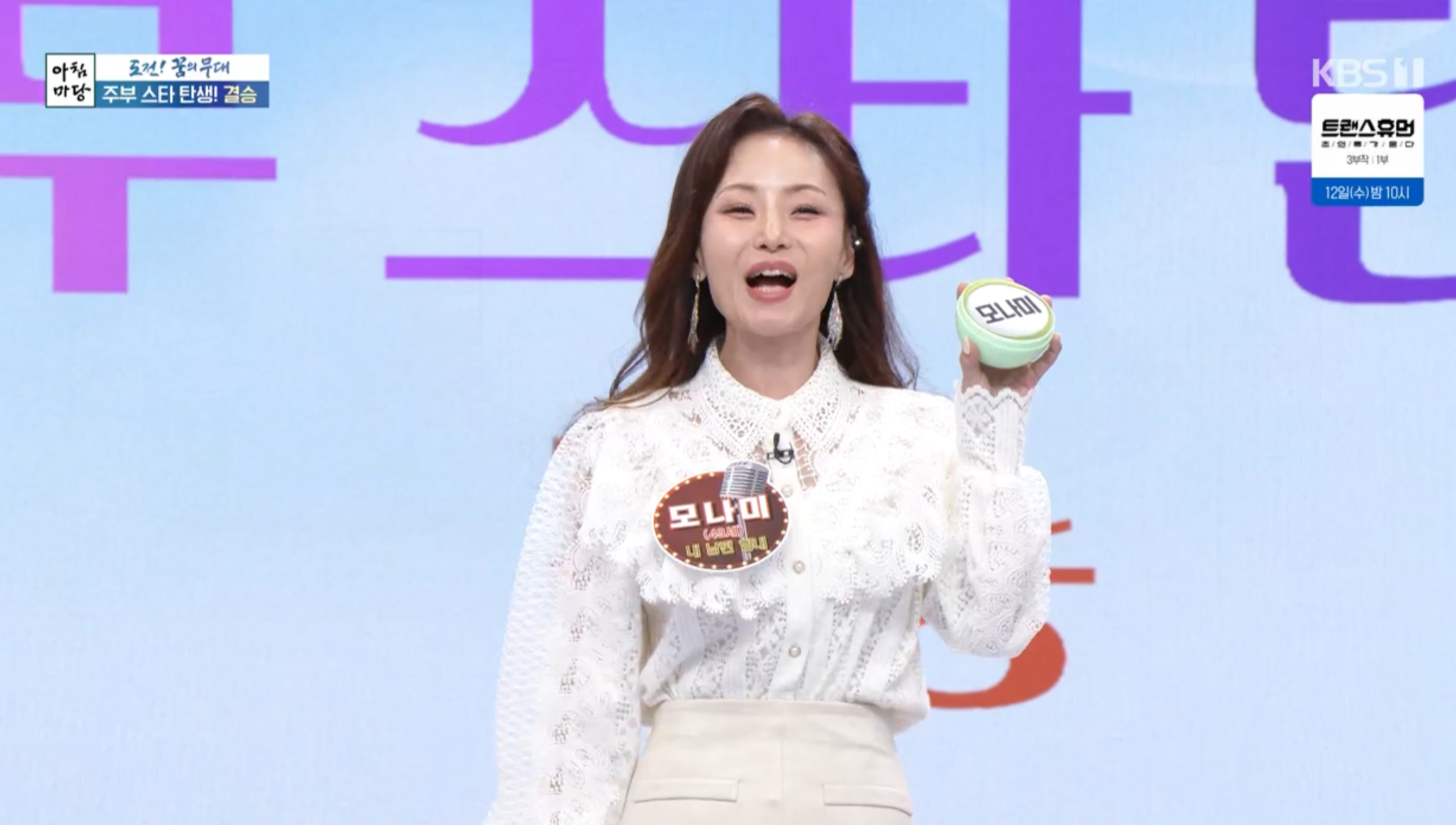 KBS1 아침마당 11월 5일 수요일 도전 꿈의 무대 주부스타탄생 결승전에는 모나미, 미키, 요시다 미호, 이사벨라, 이수나, 하경혜가 출연했습니다. 초대가수이자 패널로는 이용이 출연했습니다.