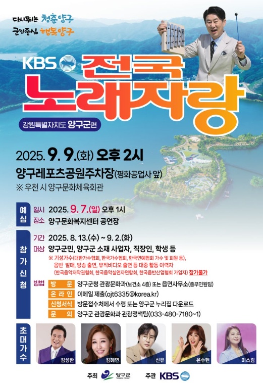 MC 남희석이 진행하는 전국노래자랑 강원도 양구군편의 예심은 2025년 9월 7일에 있었습니다. 본선 녹화날짜는 9월 9일 화요일 촬영장소는 양구레포츠공원 광장 특설무대입니다.