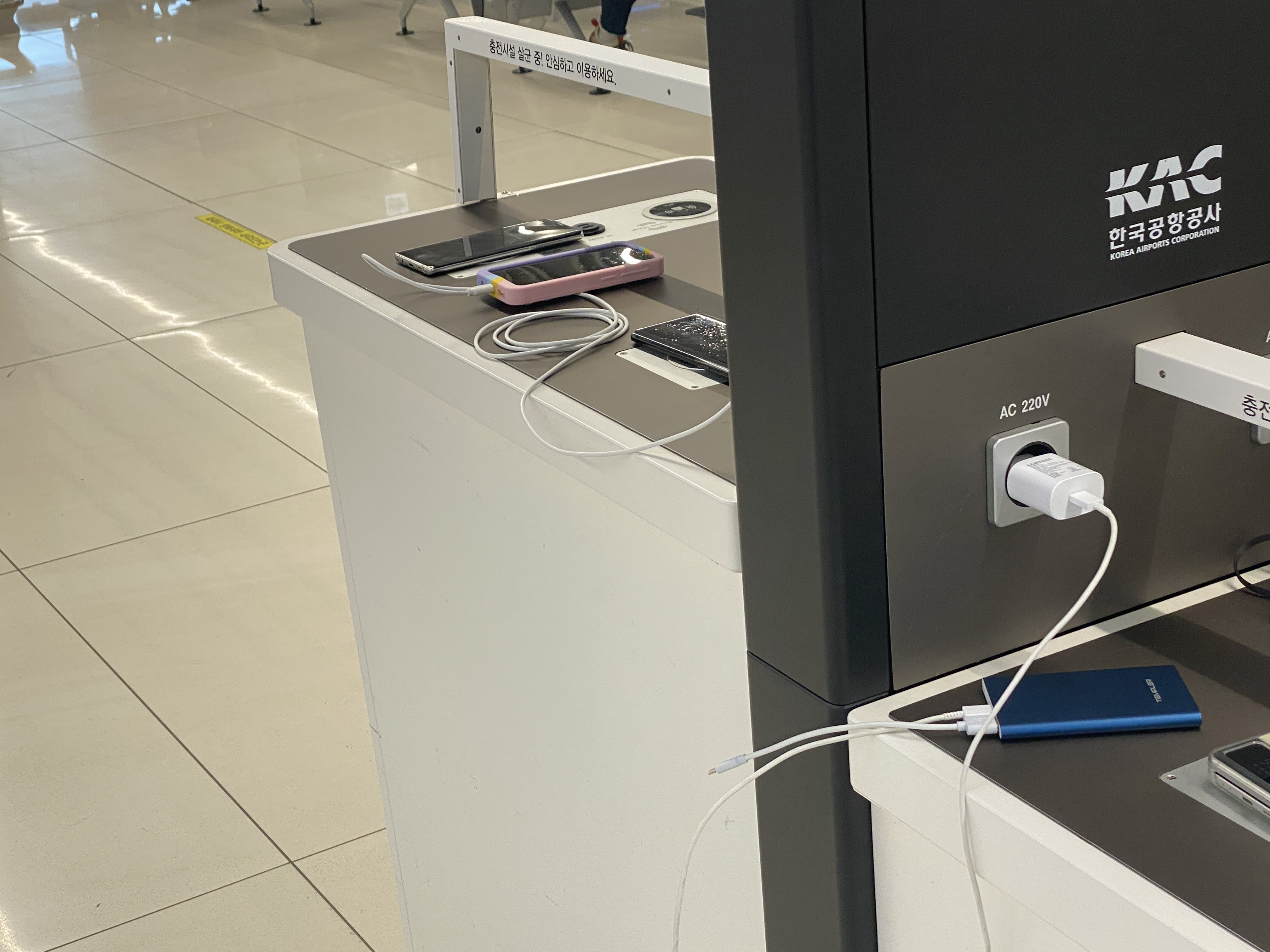 앞에 의자가 있어서 도난당하지 않게 잘 지켜봐 줍니다. 그런데 여기 올려두신 분들 그렇게 크게 연락이 급한게 아닌 이상 도난에 크게 신경쓰지 않는 것 같아보였습니다. 저는 국내선 도착 시간표와 충전대에서 충전되고 있는 것을 번갈아보고 있었습니다.