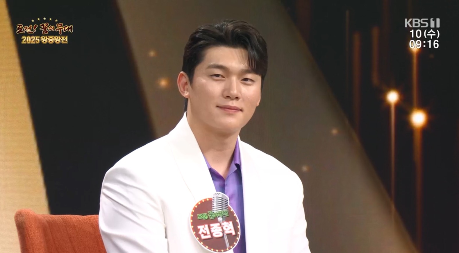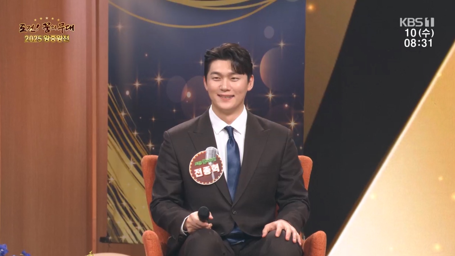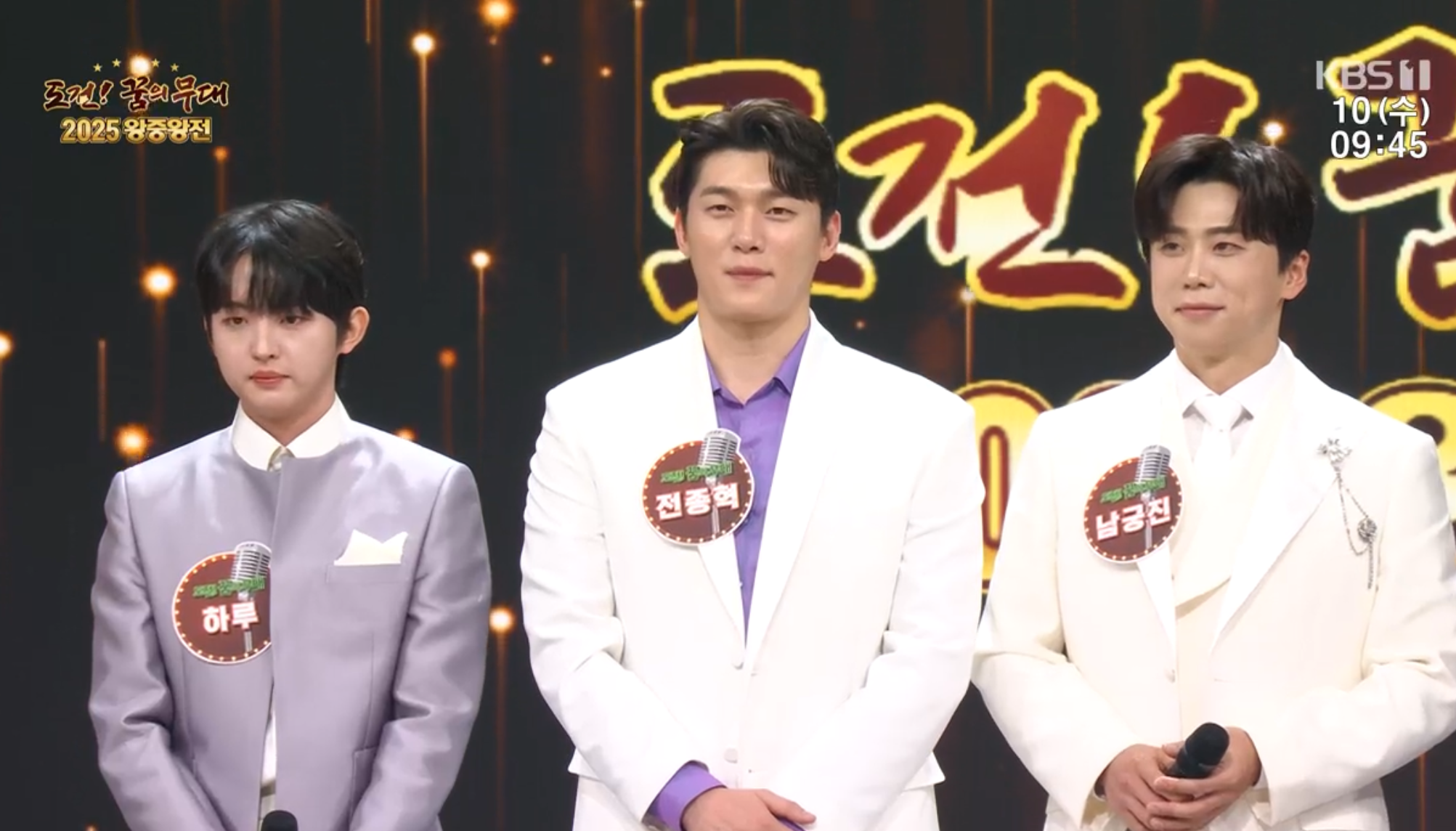KBS1 아침마당 수요일 도전! 꿈의 무대 방영일 : 2025년 12월 3일 KBS1 아침마당 12월 3일 수요일 도전 꿈의 무대 2025 왕중왕전 준결승에는 전종혁, 태남, 임다운, 하루, 남궁진, 이승우가 출연했습니다.