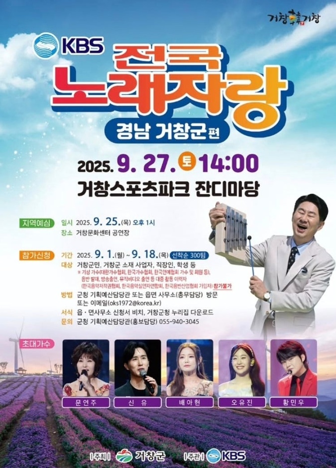 MC 남희석이 진행하는 전국노래자랑 경남 거창군편의 예심은 2025년 9월 25일 목요일 거창문회센터 공연장에서 있었습니다. 경남 거창군편 본선 녹화일은 9월 27일 촬영장소는 거창스포츠파크 잔디마당에서 녹화되었습니다.
