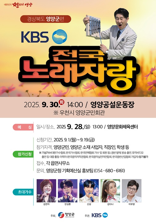 MC남희석이 진행하는 최장수 예능프로그램 전국노래자랑 경북 영양군 편의 예심은 2025년 9워 28일 영양문화체육센터에서 있었습니다. 본선 녹화일은 2025년 9월 30일 화요일 오후 2시에 녹화장소 영양공설운동장에서 녹화되었습니다.