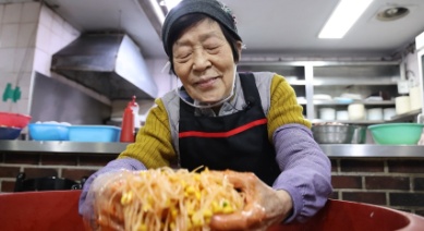 각박한 도시에서 힘들 때면 그리운 이름이 엄마입니다. 그럴 때면 장안평 중고차 시장의 사람들은 지하상가에 내려갑니다. 오래된 복도를 지나 식당 문을 열면 6명의 엄마들이 반겨주기 때문입니다. 평균 연령 80대의 어머님들이 잔칫날처럼 모여 쪽파 썰고 나물 다듬고 하느라 분주합니다. 마지막으로 팔순의 주인장 정주선 씨가 대야에 합쳐 조물조물하면 반찬들이 금세 뚝딱뚝딱 만들어집니다. 양념은 소금, 참기름, 마늘, 참깨 한 줌이면 됩니다. 여기에 아침에 장 봐온 생물 낙지를 볶아 상에 올리면 식사 준비 끝압니다.