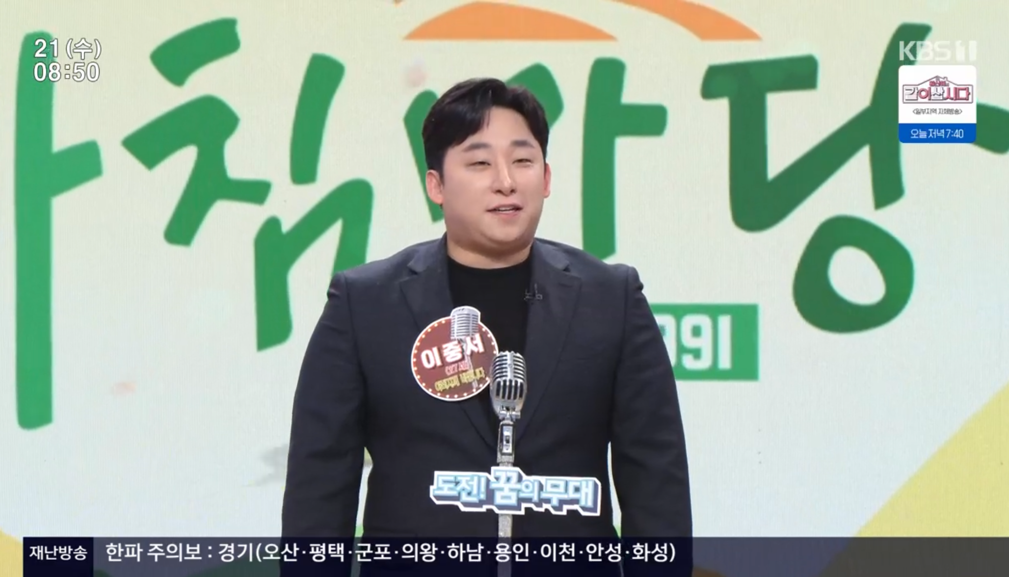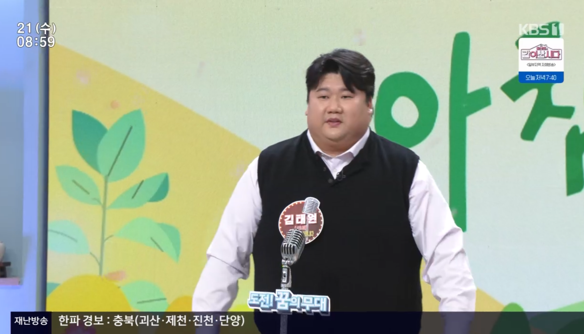 KBS1 아침마당 1월 21일 수요일 도전 꿈의 무대에는 김태원, 박나로, 이중서, 한승헌, 현대화가 출연했습니다. 초대가수이자 패널로는 왕중왕전 우승 가수 하루가 출연했습니다.