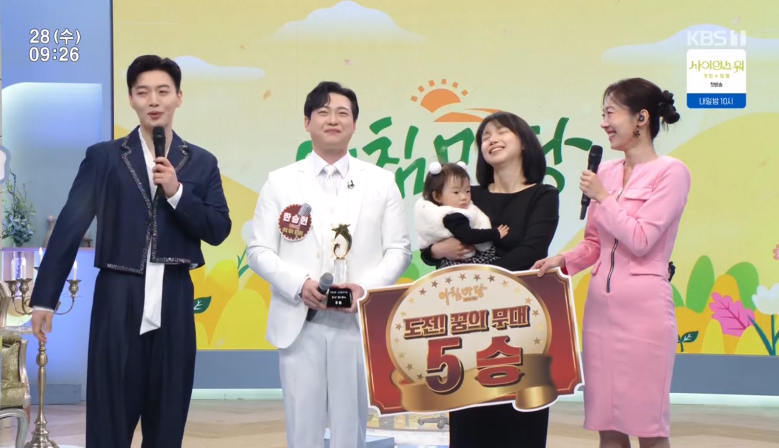 아침마당 1월 28일 수요일 도전 꿈의 무대 우승자는 한승헌이 5승을 차지하게 되었습니다.