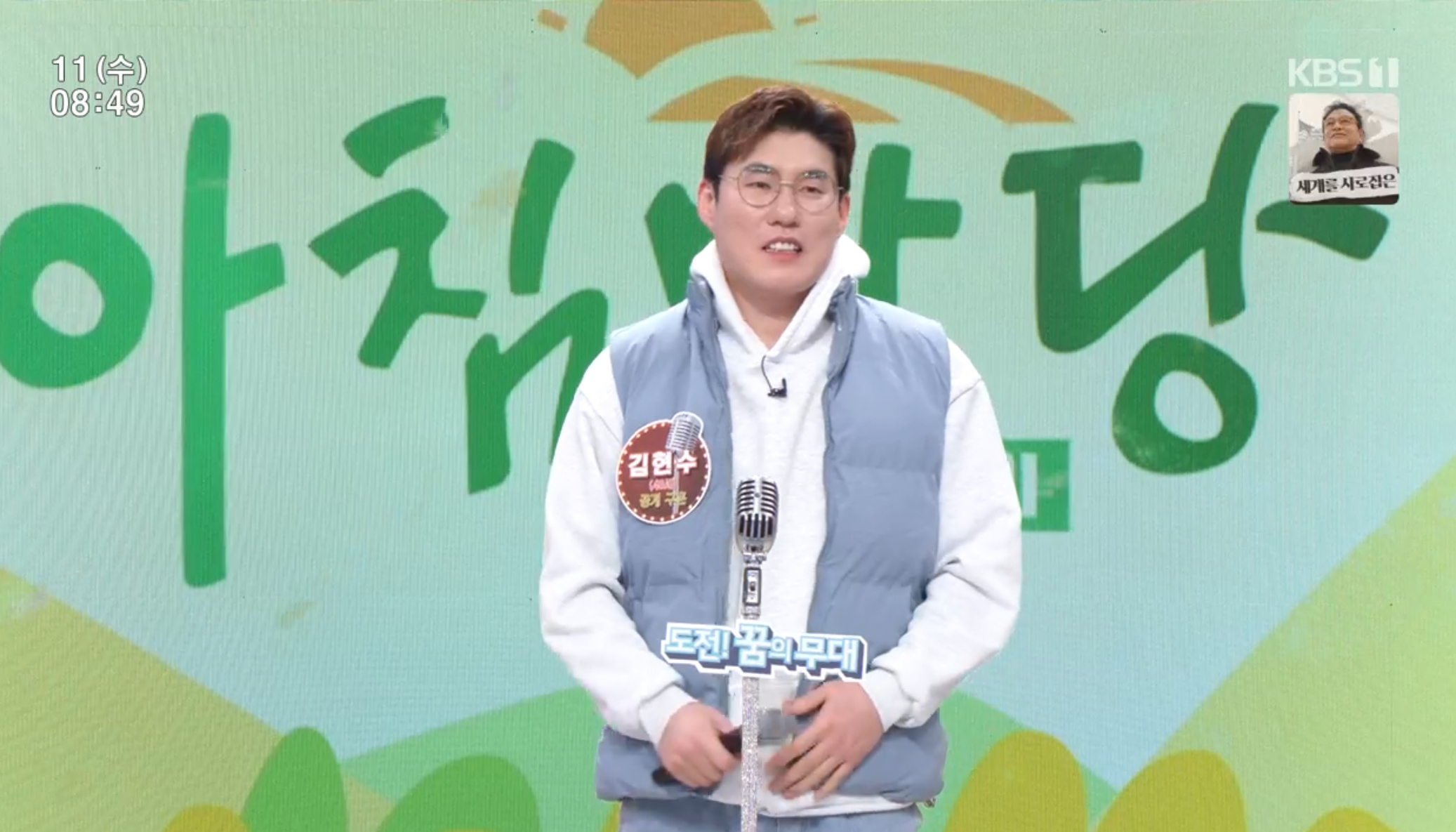 KBS1 아침마당 수요일 도전! 꿈의 무대 방영일 2026년 2월 4일 KBS1 아침마당 2월 4일 수요일 도전 꿈의 무대 패자부활전에는 강설민, 권설경, 김현민, 온유, 현대화, 홍성호가 출연했습니다. 초대가수