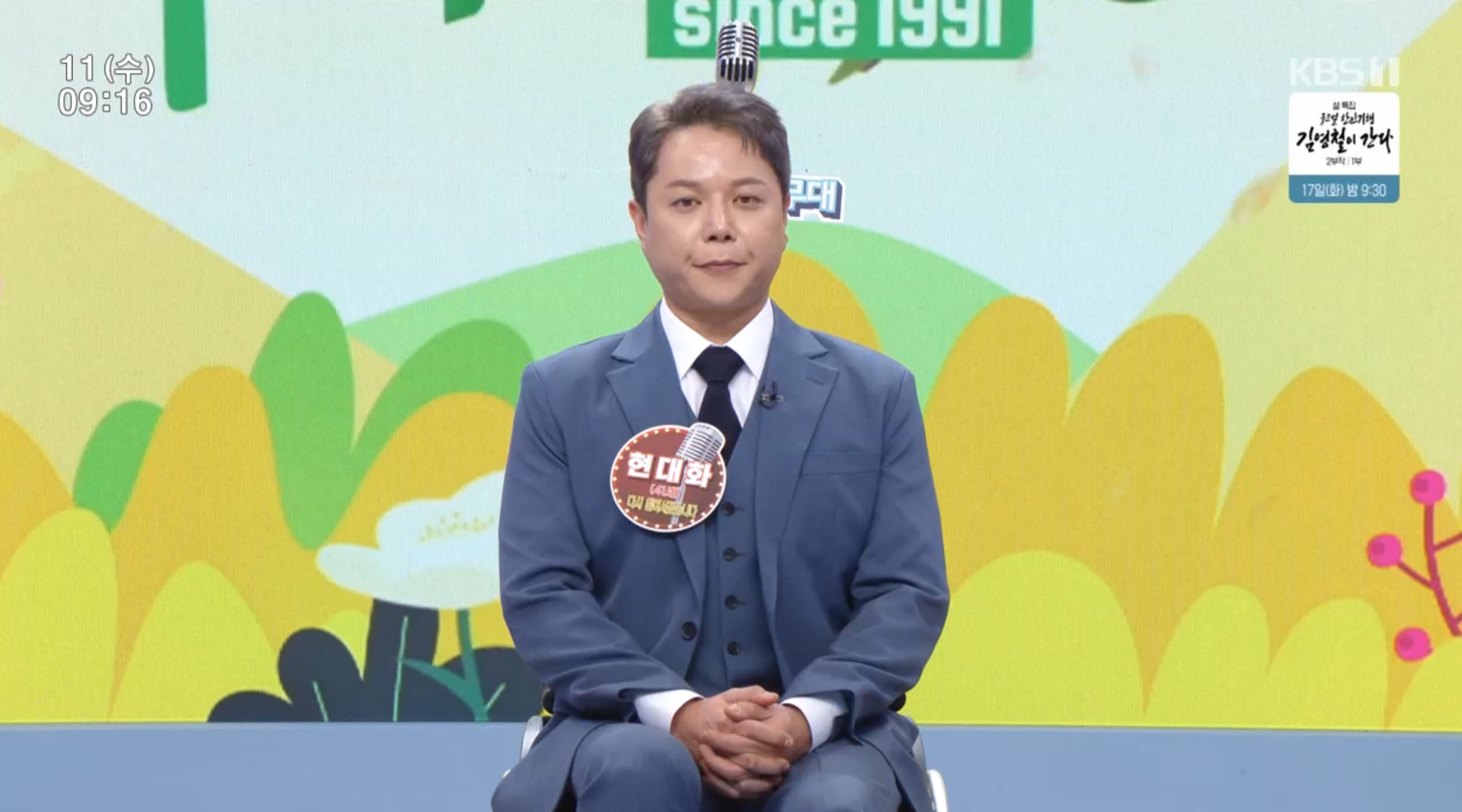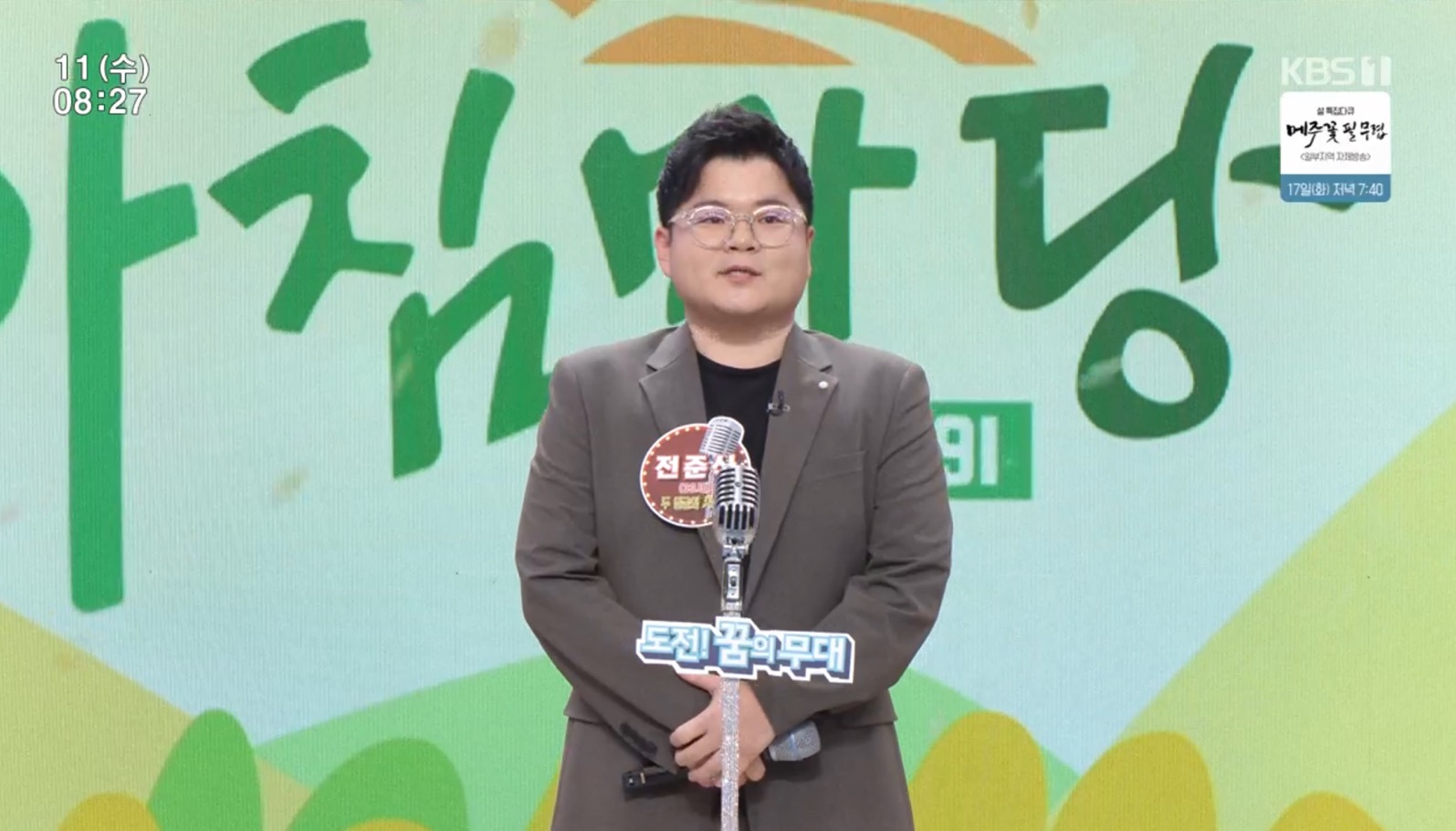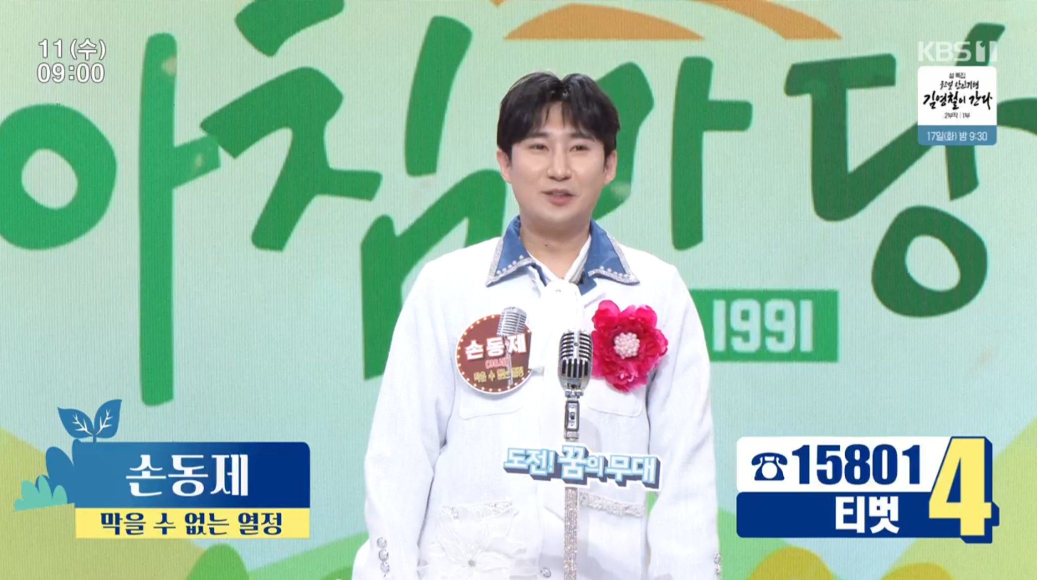 KBS1 아침마당 2월 11일 수요일 도전 꿈의 무대에는 현대화, 손동제, 송별이, 전준식, 김현수가 출연했습니다. 초대가수이자 패널로는 설운도가 출연했습니다.