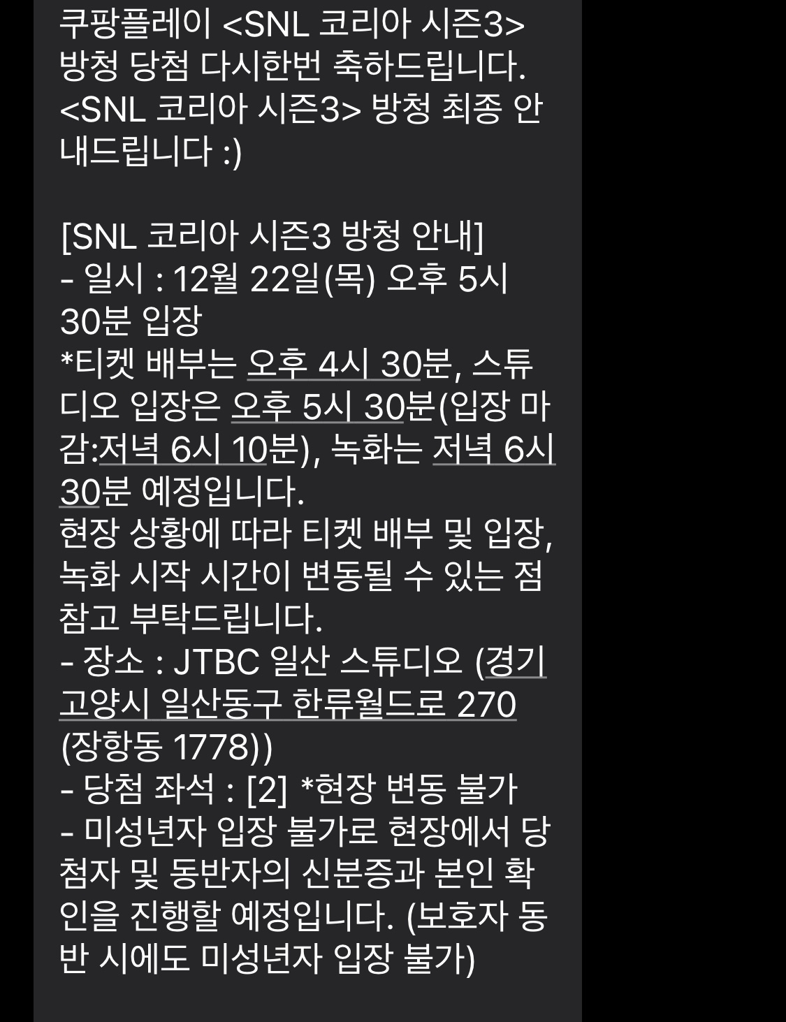 화요일 오후에 당첨문자가 왔습니다. snl 녹화는 목요일날 합니다.