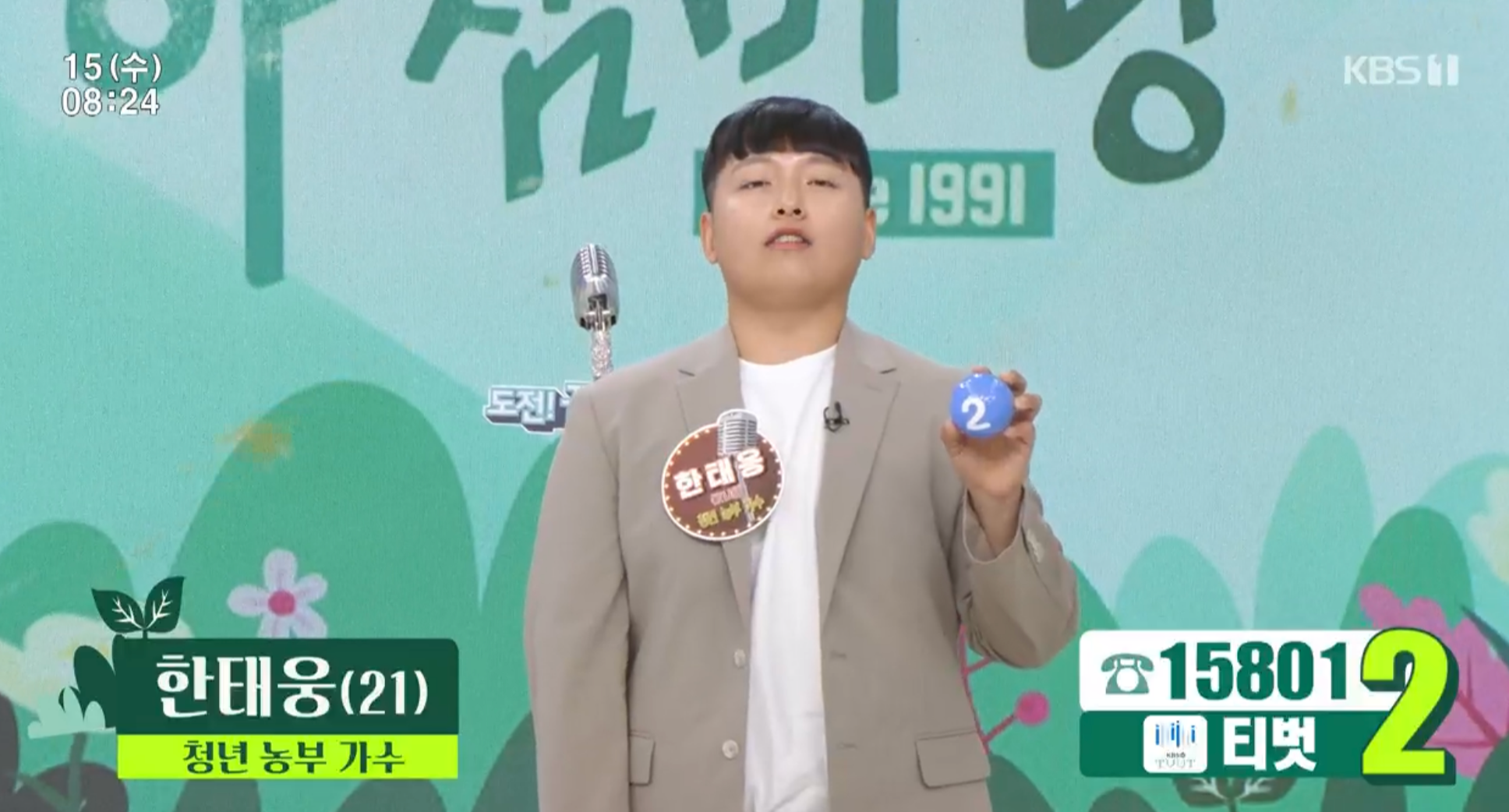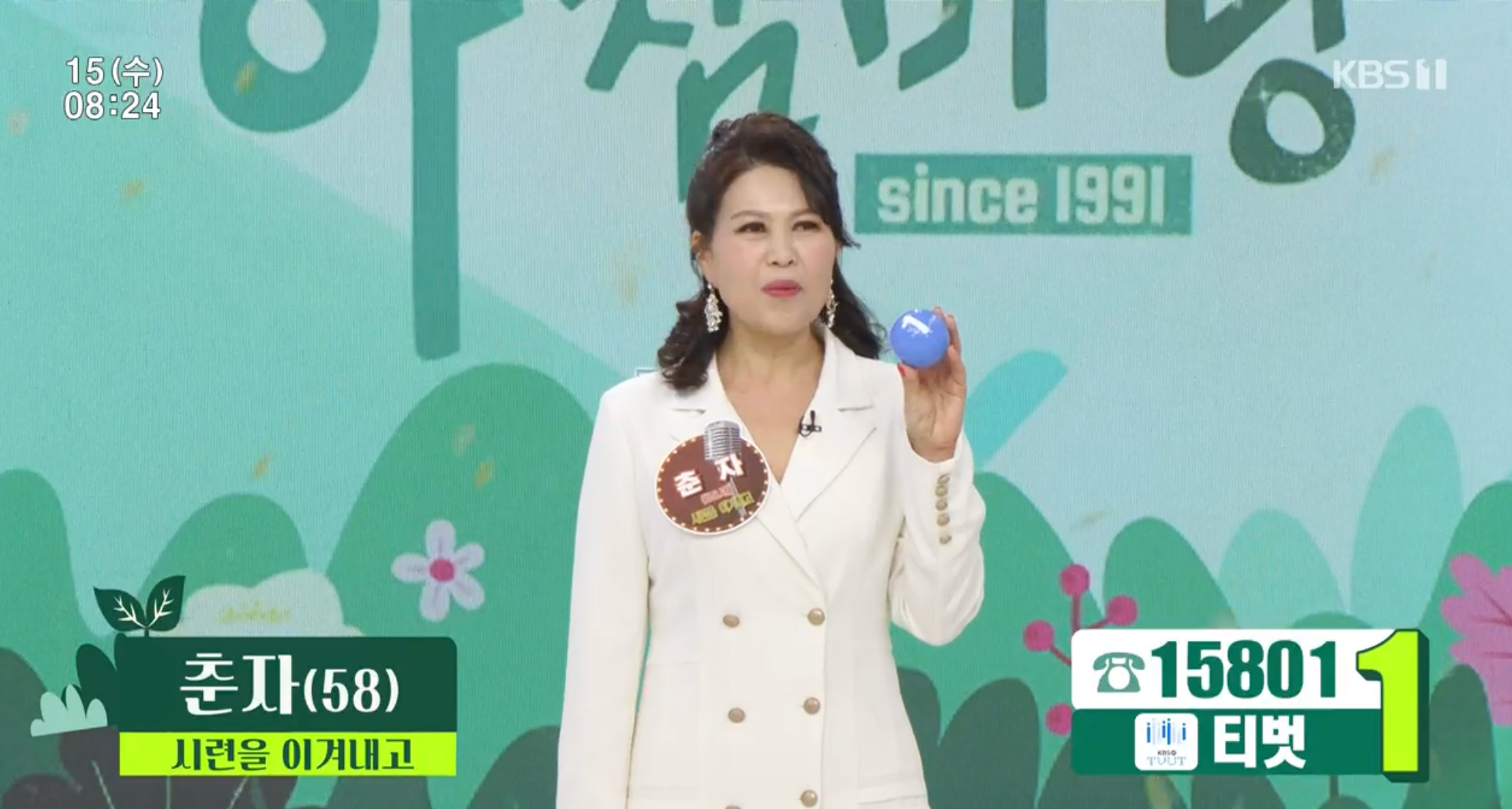 KBS1 3월 15일 아침마당 수요일 도전 꿈의 무대에는 춘자, 태곤, 전영랑, 한태웅, 옥샘이 출연했습니다. 초대가수이자 패널로는 진시몬이 출연했습니다.