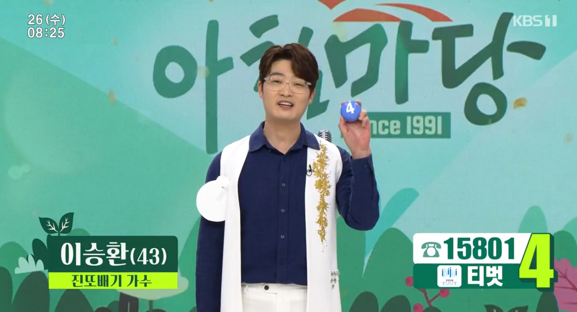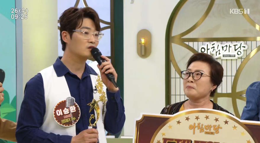 아침마당 4월 26일 수요일 도전 꿈의 무대 패자부활전 우승자는 진또배기 이승우의 아들 이승환 입니다.