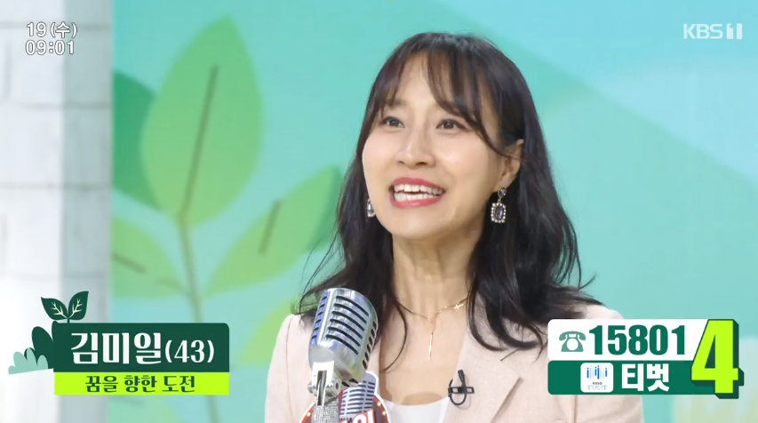 김미일 아버지와 자신의 한을 풀기 위해 출연했습니다. 어린시절부터 장기자랑 할 때 인기를 끌었던 사람이었다고 합니다. 결혼하고 아이를 낳으며 가수의 꿈을 못이뤘다고 합니다. KBS 전국노래자랑 도봉구편 예심에 신청했는데 본선에 진출했었다고 합니다. 그런데 신청한 사람이 너무 많아 새벽까지 심사했는데, 아이를 돌보느라 집에 돌아가서 잠드는 바람에 본선 진출 전화를 못받고 떨어졌다고 합니다.