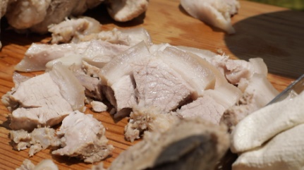 풋굿날에는 푸짐하게 통 크게 돼지 한 마리를 잡았습니다. 기술 좋은 장정들이 돼지를 해체하고 나면 본격적인 음식 장만이 시작됩니다. 사과농사를 많이 짓는 토일리에서는 돼지 수육에도 아낌없이 사과를 넣어 잡내를 잡고 달큼한 맛을 더합닏나.