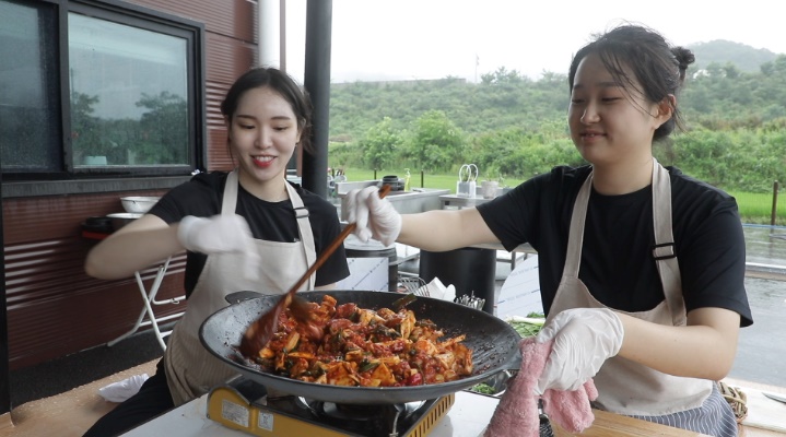 칼칼한 양념이 진하게 밴 닭갈비도 빠질 수 없습니다. 매운 음식으로 한바탕 땀을 빼고 일하면서 다시 또 땀을 빼니 그렇게 개운할 수가 없습니다. 시원하게 땀을 빼줬으니 마지막은 시원한 오이냉국으로 열기를 식혀주면서 모든 더위를 보냅니다. 더위에도 끄떡없는 무쇠 가족의 여름나기 밥상입니다.