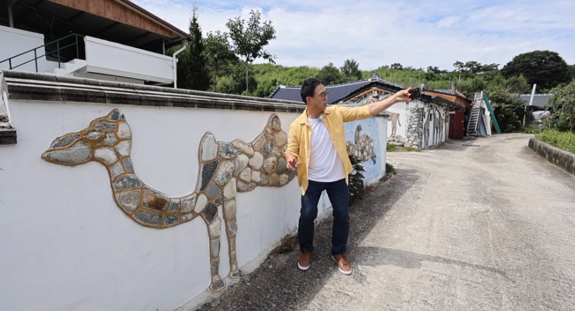 수지면의 산촌마을은 20여가구가 모여 사는 작은 동네지만 최근 특별한 풍경을 보러 오는 발길이 이어지고 있습니다. 마을 입구부터 골목길 담장마다 그려진 돌모자이크 벽화가 그 주인공입니다.