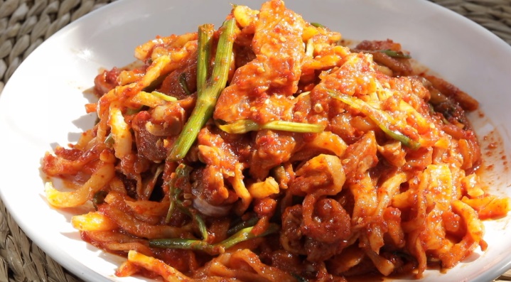 마을 사람들 남녀노소가 다 좋아하는 홍어채가 잔치준비의 기본입니다. 삭힌 홍어를 막걸리와 설탕에 재워두었다가 꼭 짜서 절인 채소와 무쳐내는 홍어채는 꼬들꼬들한 식감이 일품입니다. 큰 언니들 역시 일손을 보태려 절구통을 꺼냅니다.