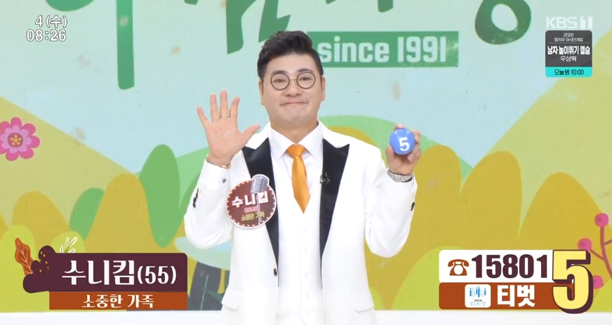 KBS1 아침마당 수요일 도전 꿈의 무대에는 나현민, 박소창, 강민찬, 수니킴, 김유리가 출연했습니다. 초대가수이자 패널로는 진성이 출연했습니다.