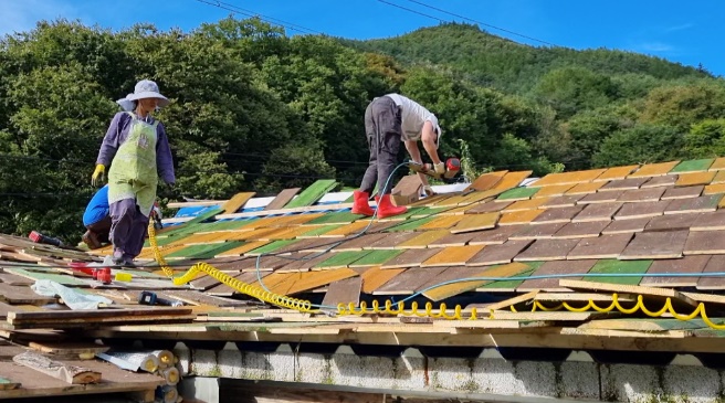 오랫동안 방치된 집은 어디하나 성한 구석이 없었지만 세자매는 직접 수리하기로 마음을 먹고, 구멍술숭 뚫린 벽을 황토를 개어 메우고, 오 래 방치된 지붕을 뜯어내 서까래는 살렸습니다. 직접 포크레인까지 배워가며 3년에 걸쳐서 세 채의 집을 고쳤고 자매가 꿈꾸던 그림같은 집이 완성되었습니다.