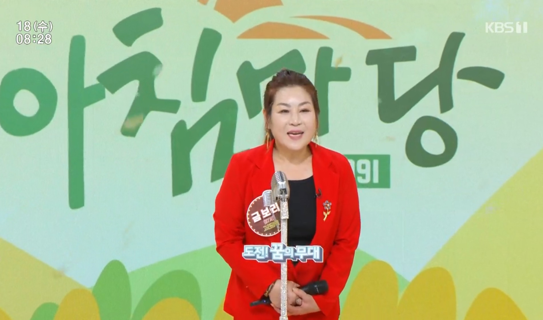KBS1 아침마당 10월 18일 수요일 도전 꿈의 무대에는 나현민, 금보리, 이현호, 최종범, 이선우가 출연했습니다. 초대가수이자 패널로는 김용임이 출연했습니다.