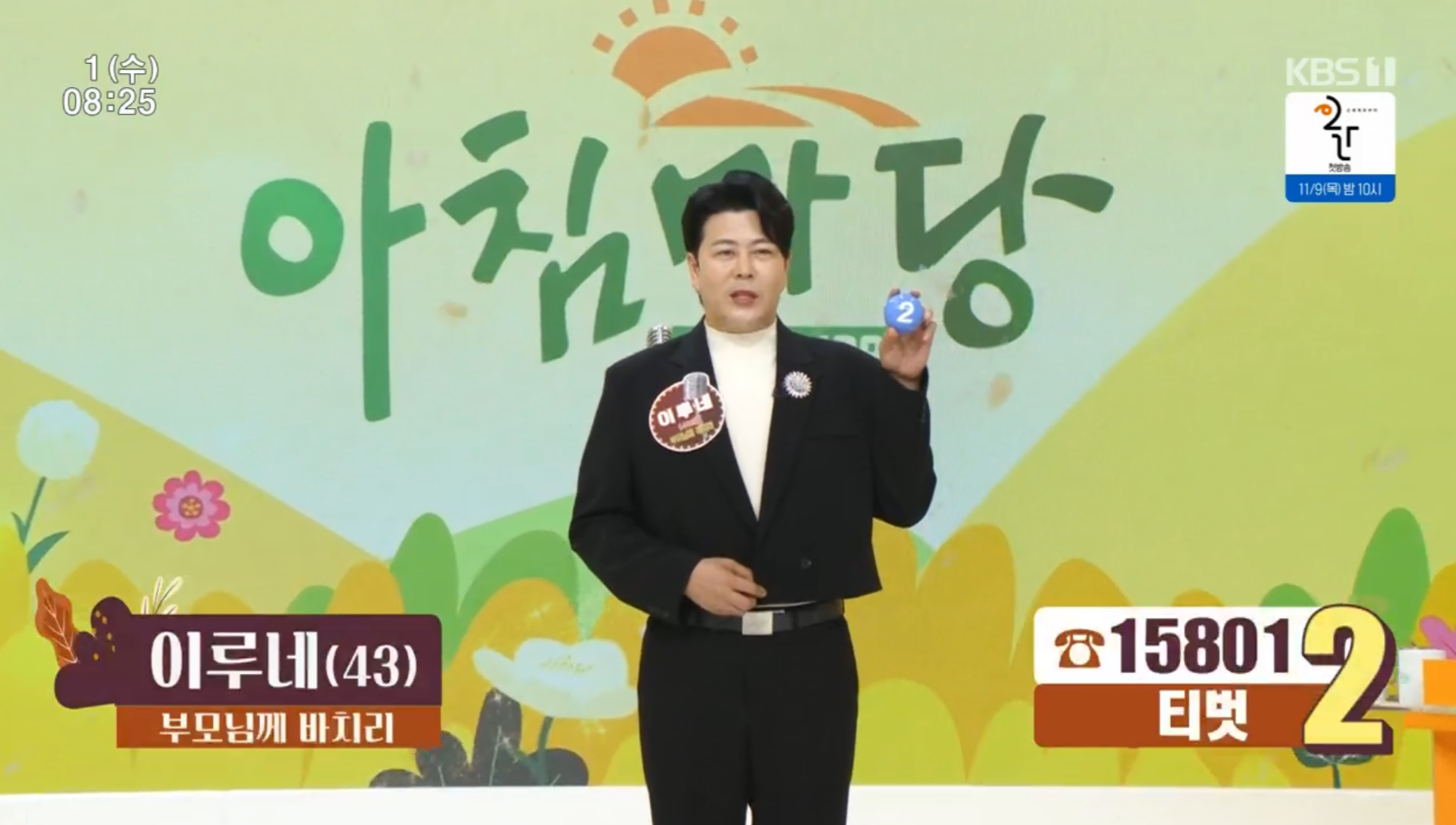 KBS1 아침마당 11월 1일 수요일 도전 꿈의 무대는 패자부활전으로 김무진, 이루네, 이사벨라, 황준, 홍향희가 출연했습니다. 초대가수이자 패널로는 김범룡과 김충훈이 출연했습니다.