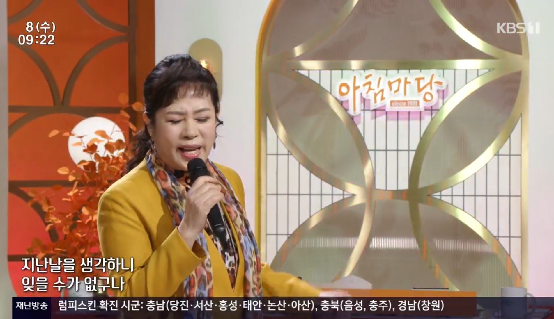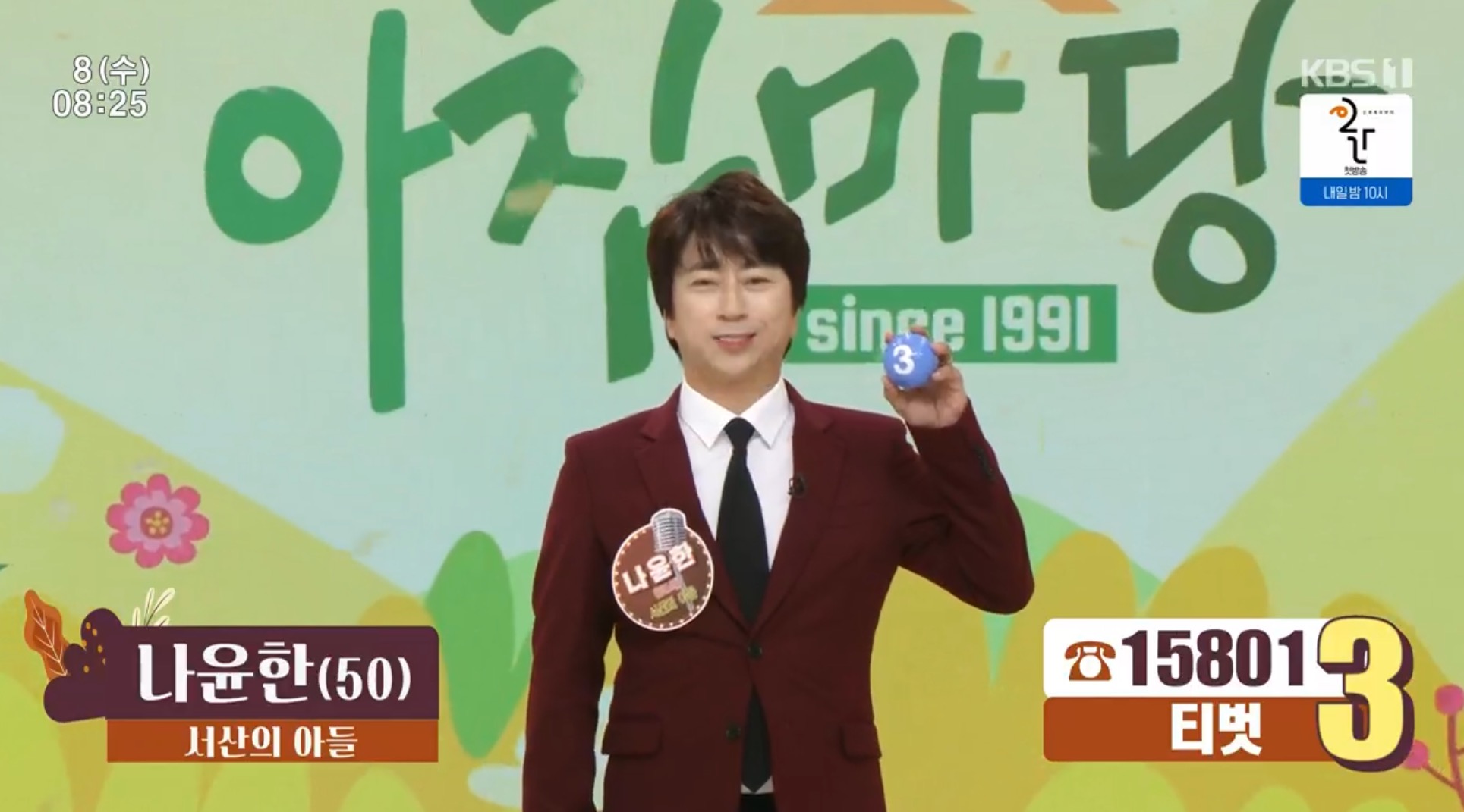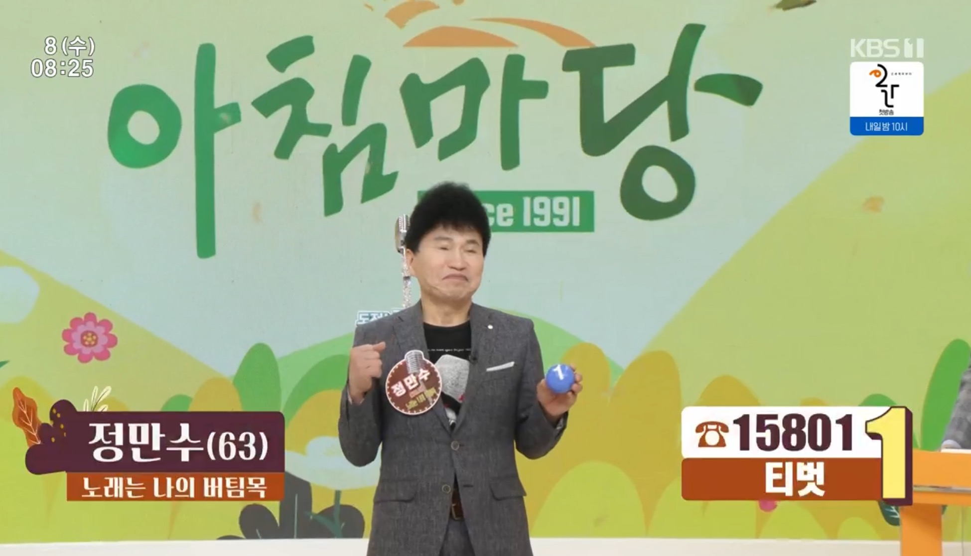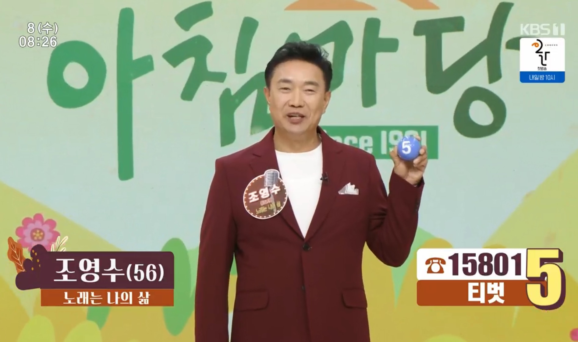 KBS1 아침마당 11월 8일 수요일 도전 꿈의 무대 패자부활전에는 정만수 이현호 나윤한 하태하 조영수가 출연했습니다. 초대가수이자 패널로는 이자연이 출연했습니다.