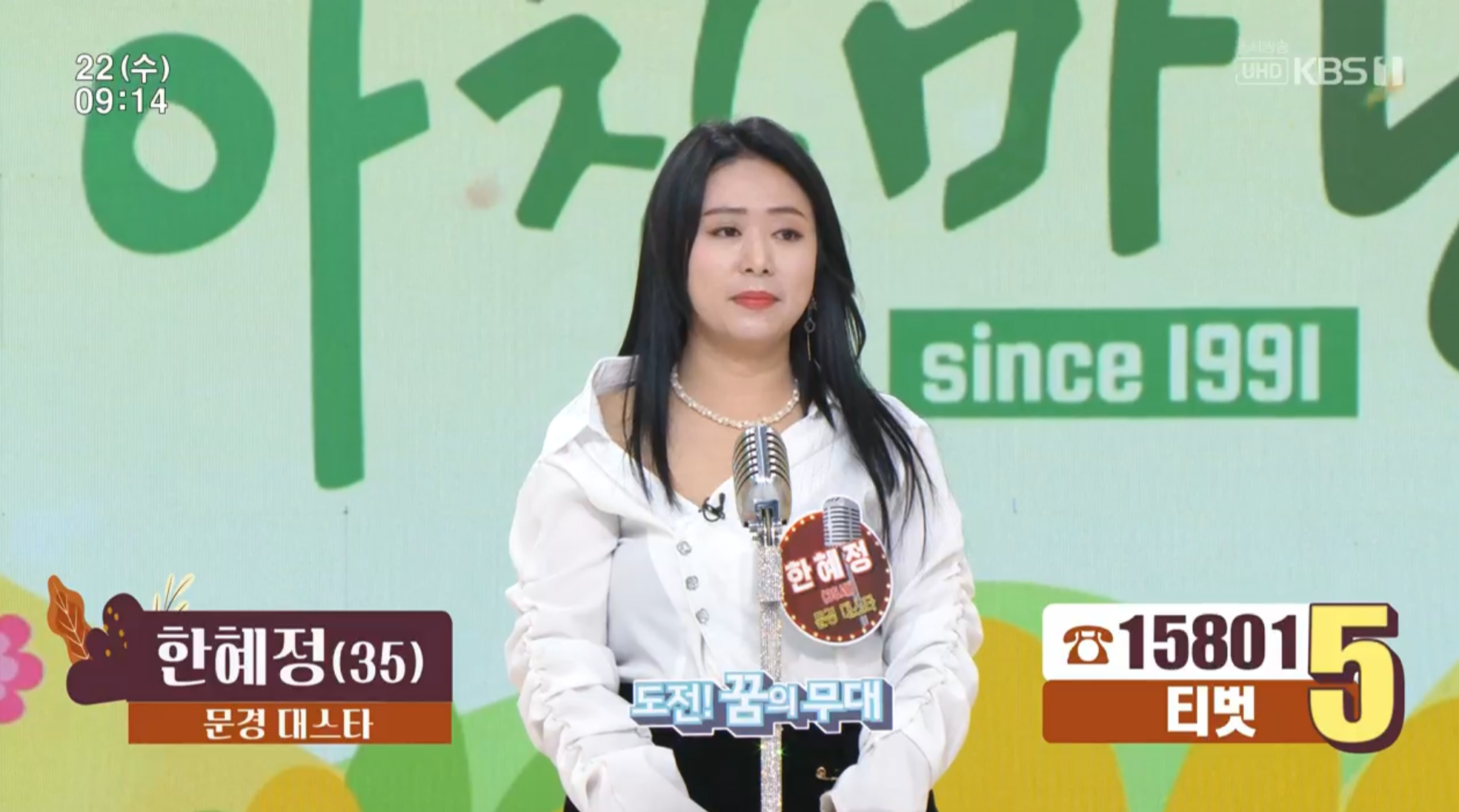KBS1 아침마당 11월 22일 수요일 도전 꿈의 무대에는 하태하, 태남, 조금주, 한혜정, 김재이가 출연했습니다. 초대가수이자 패널로는 진시몬이 출연했습니다.