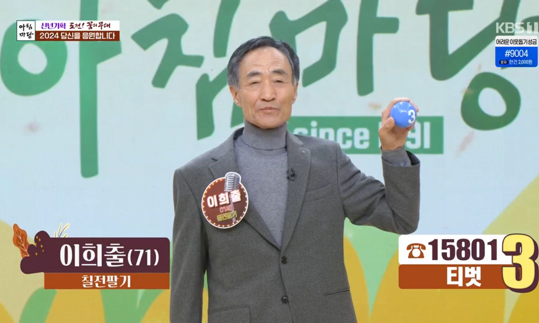 KBS1 아침마당 1월 3일 수요일 도전 꿈의 무대에는 박준서, 신재협, 이희출, 김승권, 이경직이 출연했습니다. 초대가수이자 패널로는 이동준이 출연했습니다.