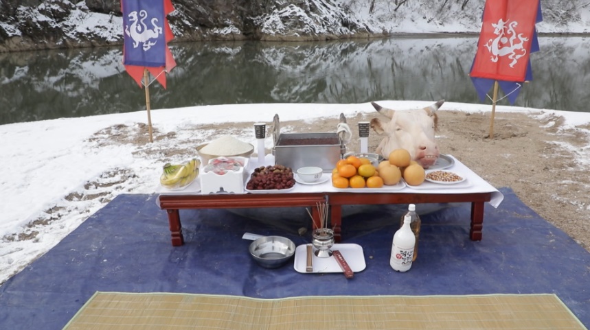 보기에도 상서로운 기운이 서린 듯한 기암절벽 아래로 미호강이 고고히 흐르는 곳, 여기 강변에 소를 매어두면 강에 사는 용이 소를 잡아 먹고 머리만 남겨놓았다는 전설이 전해집니다. 인근 마을 사람들은 승천하지 못한 용이 여전히 절벽 아래에 머물며 마을을 보살핀다고 믿고 있습니다. 갈탄마을과 도룡마을 사람들이 용신님께 제를 올리기 위해 강변에 모였습니다.
