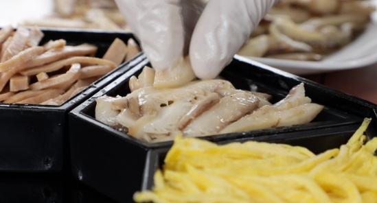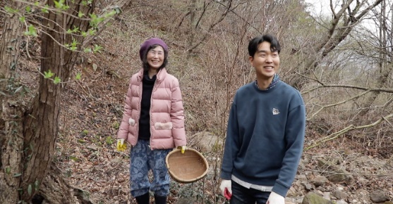 영미 씨의 아들 성민(38세) 씨와 함께 표고버섯도 따기도 하고, 땅에서 손수 기른 도라지도 캐냅니다. 자연의 맛을 그대로 살려 들기름에 볶아낸 재료는 차곡차곡 구절판 위에 담아 머위 쌈을 함께 올려주었습니다.