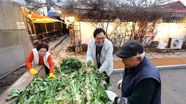 심학산의 등산객과 관광객들이 몰리며 음식 골목이 형성된 심학산의 아래 작은 시골 마을 길을 걷다 큰 소리를 내며 다가오는 경운기를 마주했습니다. 경운기에는 무를 가득 싣고 운전하는 김현득(87세) 어르신께 말을 걸던 이만기가 갑자기 뛰기 시작했습니다. 김현득 어르신을 따라가 보니 한 식당 마당에서 일을 하며 남편을 기다리던 정영자(79세) 씨가 있었습니다.