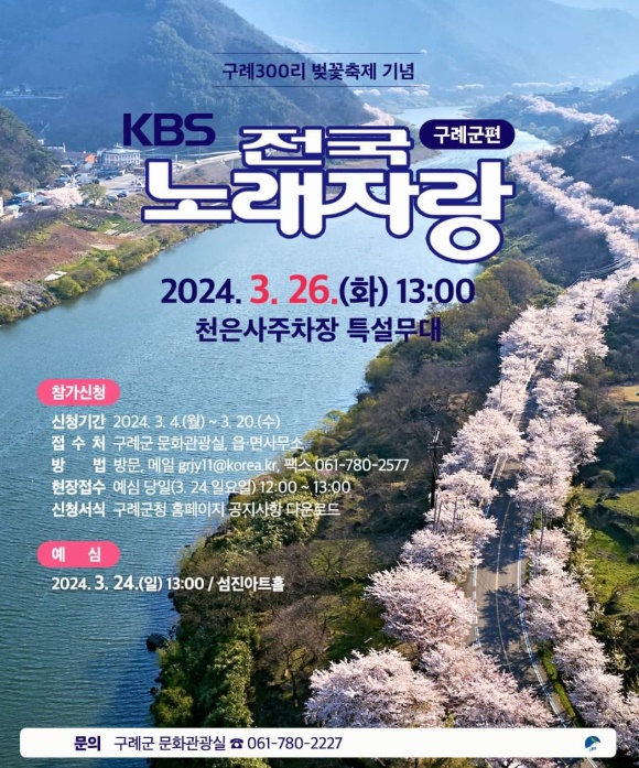 4월 29일 방송되는 전국노래자랑은 전라남도 구례군편입니다. 전국노래자랑 구례군편은 구례300리 벚꽃축제기념으로 개최되었습니다. 예심은 2024년 3월 24일 일요일 오후 1시 섬진아트홀에서 열렸습니다. 구례군편의 본심 녹화장소는 천은사 주차장에 마련된 특설무대입니다.
