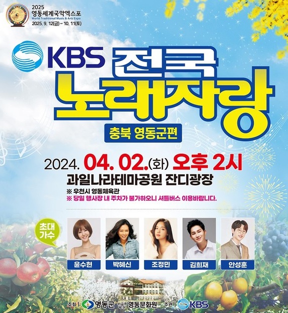전국노래자랑 5월 5일에는 국악과 과일의 고장으로 널리 알려진 고장 충청북도 영동군에서 개최되었습니다. 전국노래자랑 영동군편의 녹화 날짜는 2024년 4월 2일 화요일 오후 2시에 녹화되었습니다. 촬영 장소는 과일나라테마공원 잔디광장입니다.