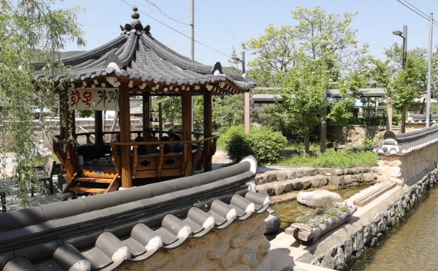 마을 길을 걸으며 고택들과 그 고택의 멋을 살려주는 기와를 보는 동네지기 이만기입니다. 금수라 불렀던 마을인 만큼 맑고 깨끗한 천이 흐르는 수로를 보며 감탄합니다. 금소마을의 수로를 따라 걷다 도란도란 이야기가 들려오는 정자를 발견했습니다.